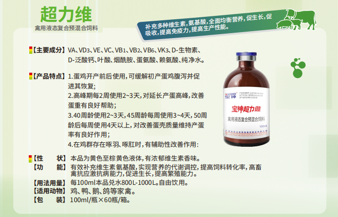 (三)防治。调整日粮结构,供给泛酸含量丰富的饲料。病畜可用泛酸注射液进行治疗,剂量为鸡20mg,其他动物每千克体重0.1mg,肌肉注射,每天1次。预防本病的关键是日粮中保证足够的泛酸,以满足动物不同生理阶段的需要,需要量为:1~6日龄雏鸡6~10mg/kg,产蛋鸡15mg/kg,生长猪11~13.2mg/kg,繁殖及泌乳阶段13.2~16.5mg/kg。